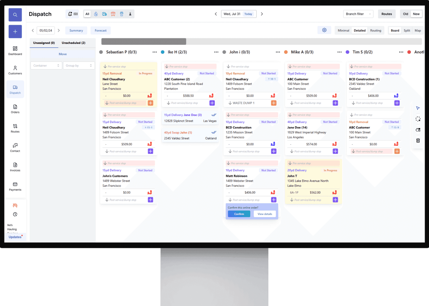 Roll-off workflows for containers, jobs, drivers, and billing.