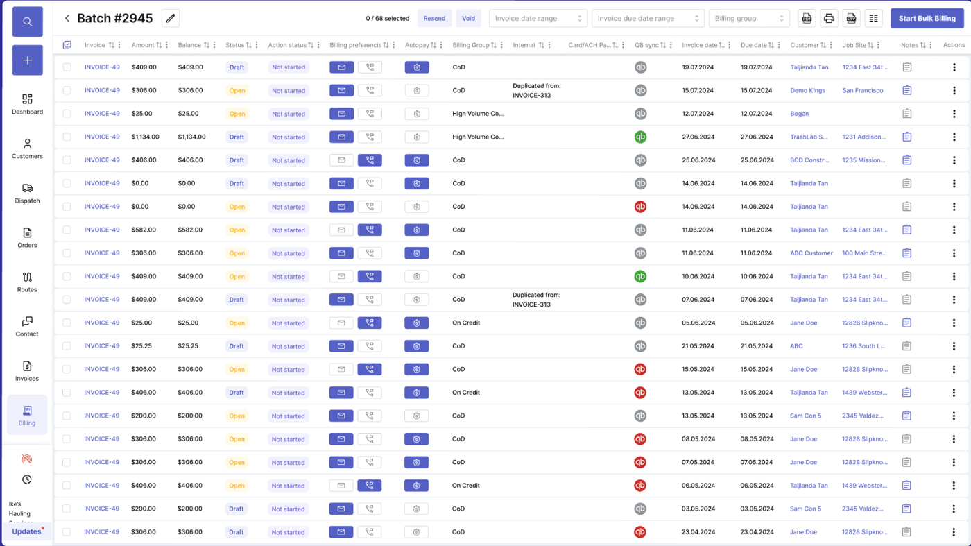 One-time invoices for roll-off, special pickups, and temporary jobs.