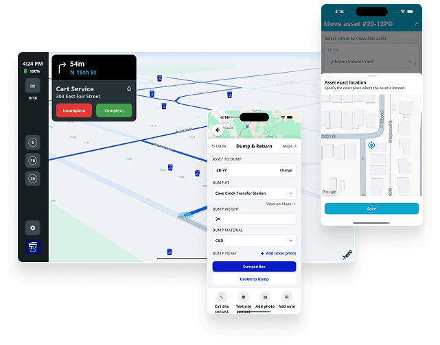 Works for roll-off, recurring collection, portable toilet, recycling, and other field workflows.